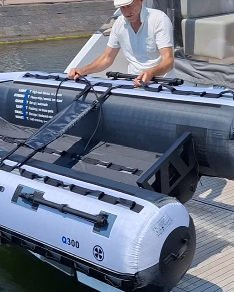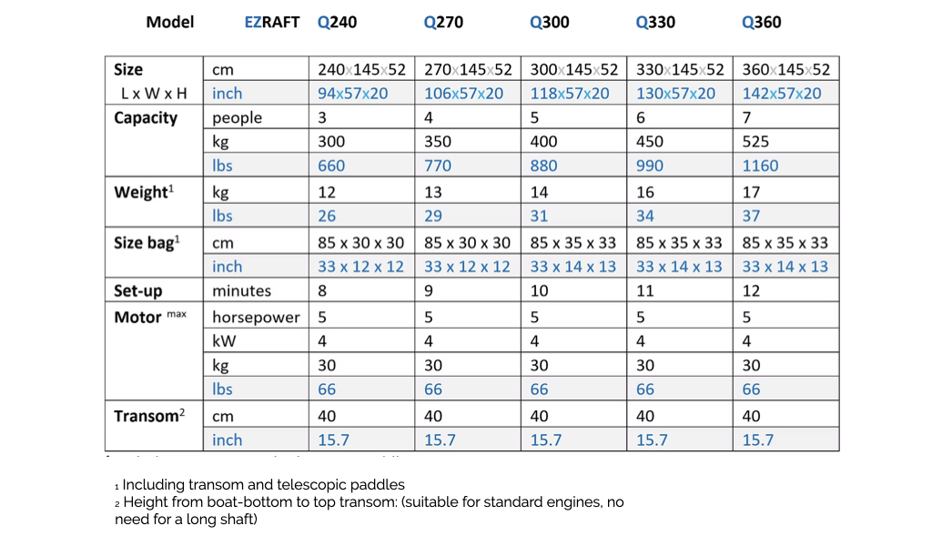 Our size range includes the Q240, Q270, Q300, Q330 and the Q360. So we’re able to set you up with a smart EZ Raft that no matter your needs, it will fit in a bag small enough for bringning it on your boat, van or even the trunk of your car. AND the total weight of your EZ Raft ranges from 12 kg to 17 kg.