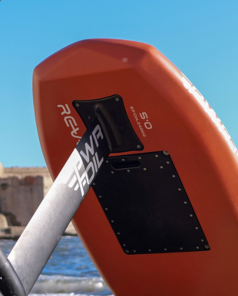 The REVO Air revolutionizes e-foiling with its hybrid technology: a rigid structure for strength and an inflatable Dropstitch premium contour for lightness and safety. Its generous volume ensures excellent stability, ideal for beginners.